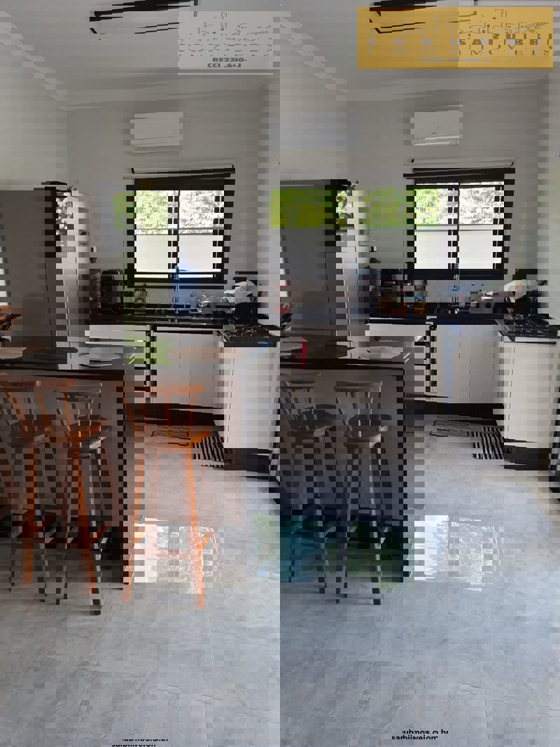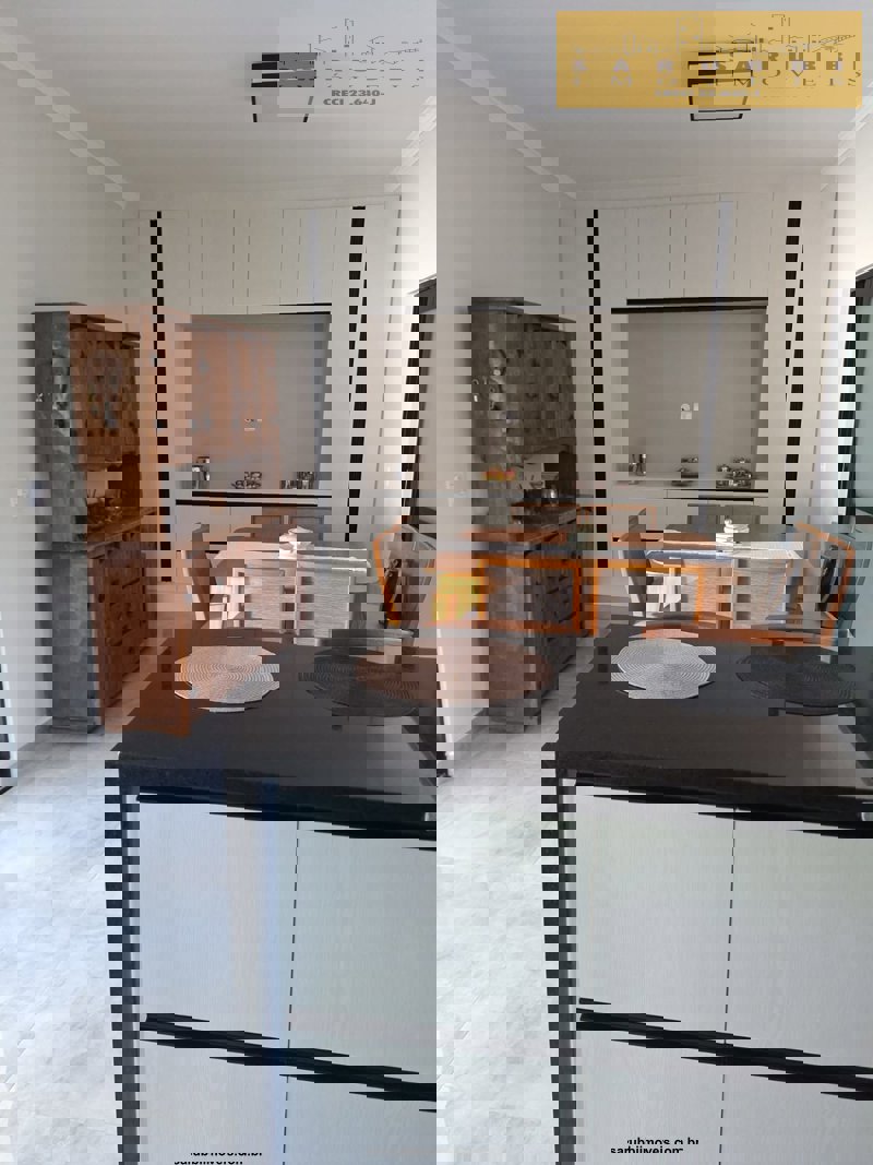 A cozinha possui móveis planejados e integração com a sala de jantar, criando um ambiente funcional e acolhedor para o dia a dia e para receber convidados.